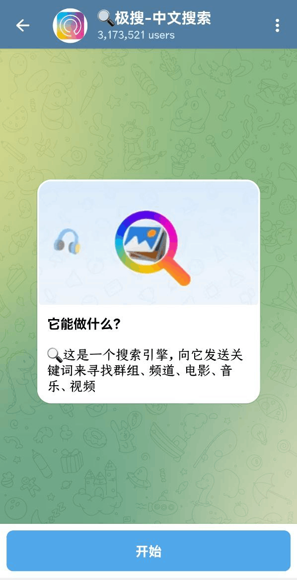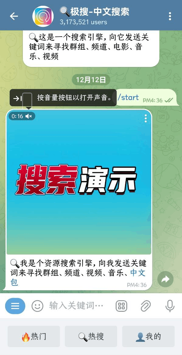 - 然后在输入框中输入“@jisou”,注意是输入拼音,如果输入的是中文,是搜不到结果的,点开第一个,这是tg内支持中文关键词搜索的导航机器人: