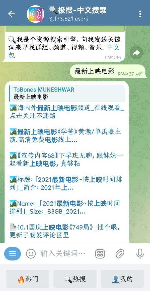 - 点击对话框中的“开始”,随后发送你想要的资源关键词,例如“最新上映电影”: